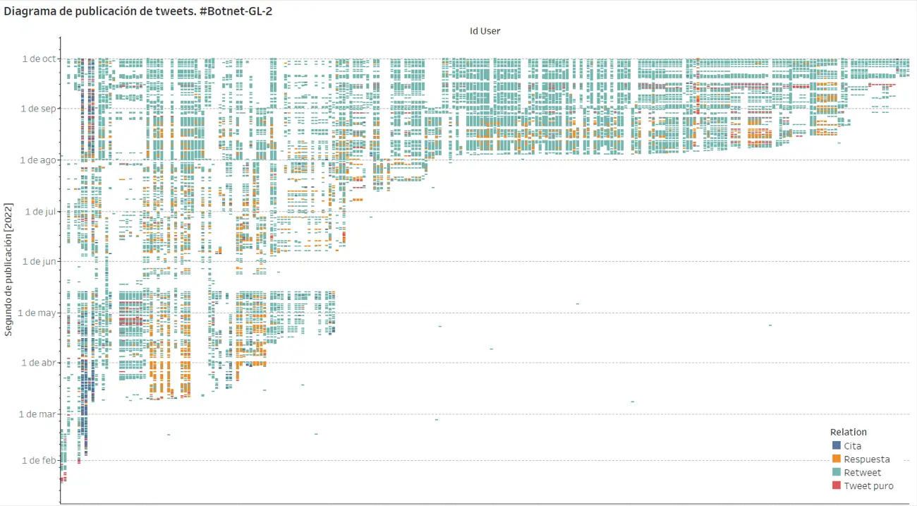 En la siguiente imagen se representan la fecha de publicación de tweets vs. ID de Twitter de cada una de las cuentas de la #Botnet-GL-2. Si bien las cuentas no publican tweets de forma simultánea, el diagrama permite pueden observar coincidencias en el tipo de tweets e instantes de publicación de tweets de las cuentas de la botnet. La misma observación fue realizada cuando se denunció a la #Botnet-GL-1.