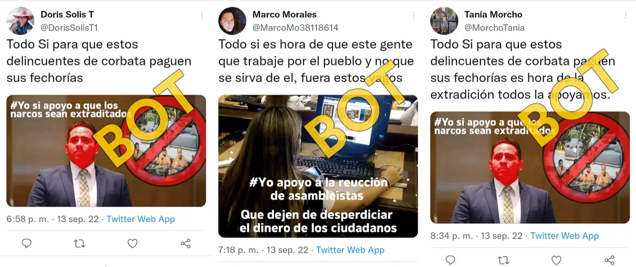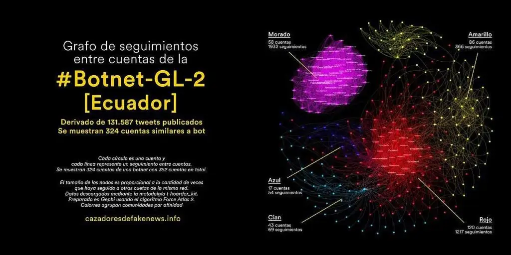 Ambas botnet, #Botnet-GL-1 (suspendida) y #Botnet-GL-2 (actualmente activa), están vinculadas con un grupo de cuentas identificadas como la “Red de Tuiteros Democráticos”, que aparentan se operadas por ciudadanos ecuatorianos que apoyan al presidente Guillermo Lasso, pero que en su mayoría poseen comportamiento similar a bot.
