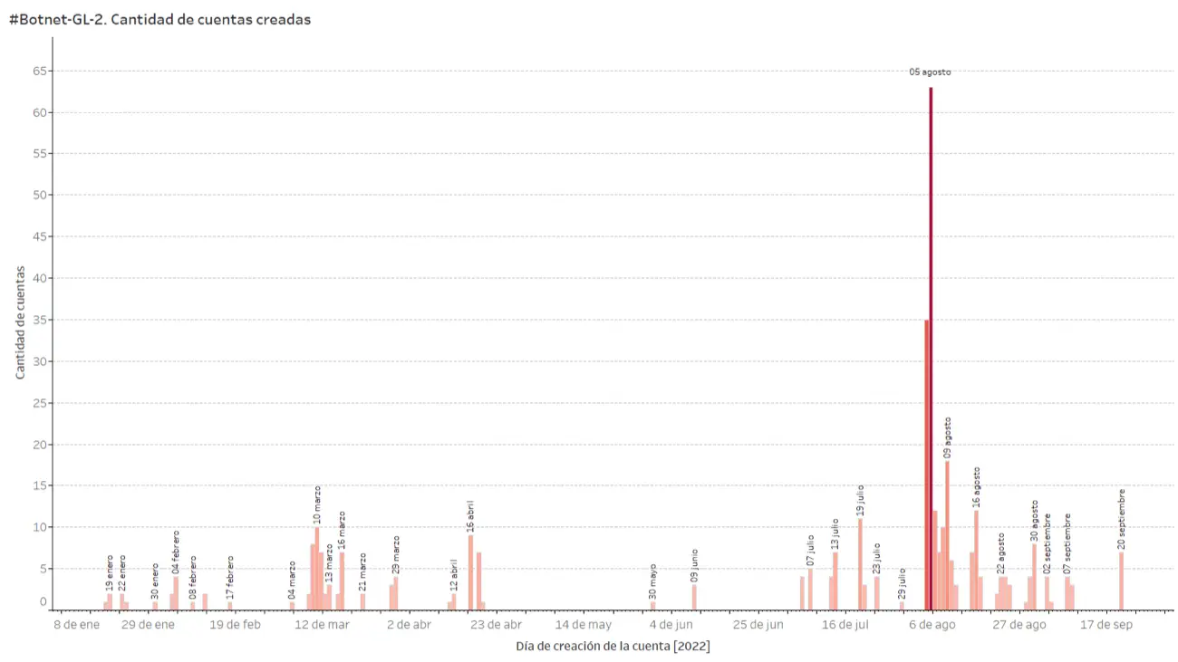 La mayoría de las cuentas que forman parte de #Botnet-GL-2, fueron creadas después de la suspensión permanente de la #Botnet-GL-1. Apenas entre el 4 y el 5 de agosto de 2022 se crearon 98 de las cuentas de #Botnet-GL-2, dos días después de la publicación del hilo en Twitter en el que se denunció a la #Botnet-GL-1.
