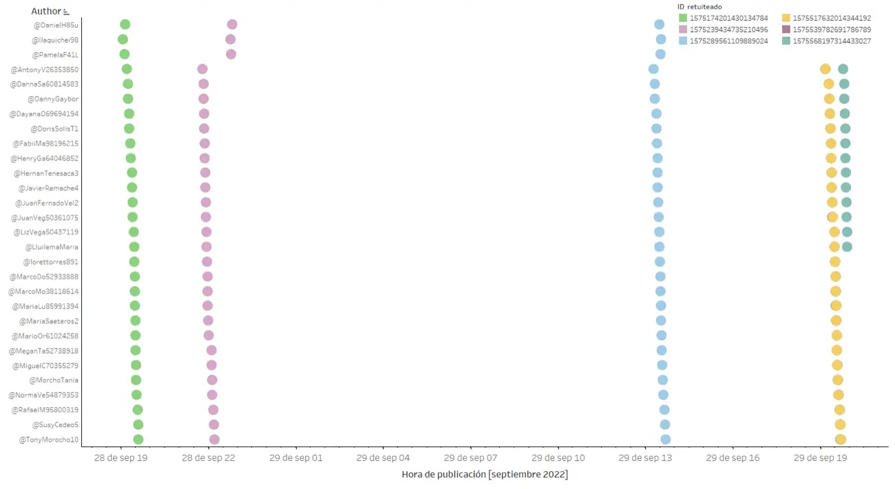 En el siguiente diagrama, cada color representa el momento en que una cuenta de la Botnet-GL-2 retuiteó un tweet publicado por la cuenta presidencial @LassoGuillermo. Se puede observar la sincronización entre las cuentas, que retuitean en generalmente en el mismo orden, con intervalos de entre 2 y 4 minutos.