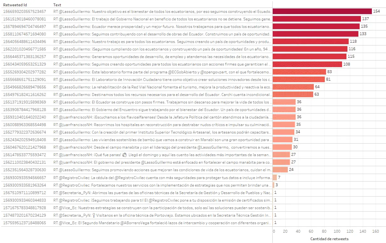 La etiqueta #JuntosLoHacemosPosible, que apareció en 17 tweets de @LassoGuillermo y en 5 tweets de Juan Francisco Núñez, Gobernador de Manabí, recibió 1638 retweets por parte de la #Botnet-GL-2, entre el 25 de julio y el 13 de septiembre de 2022.