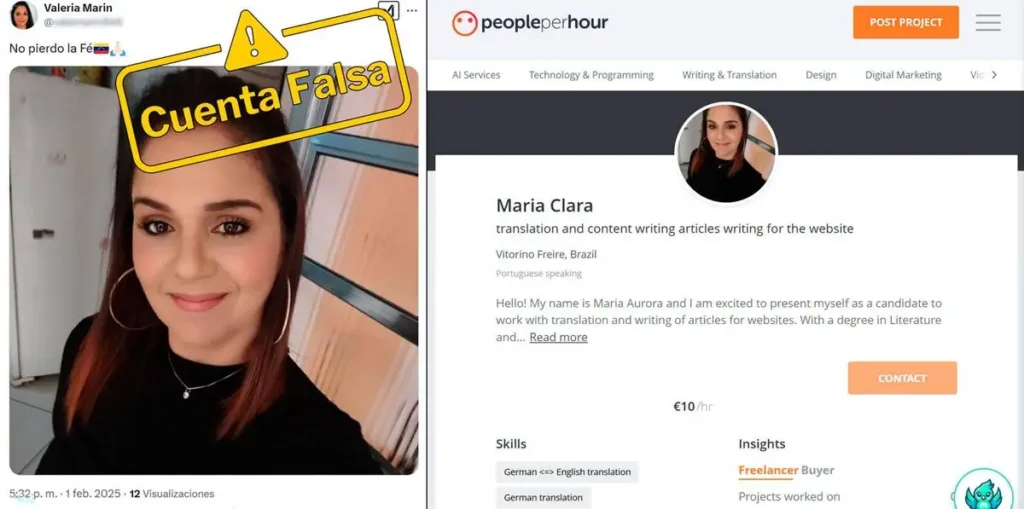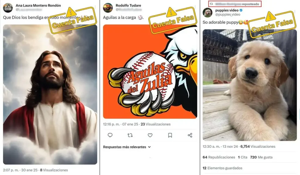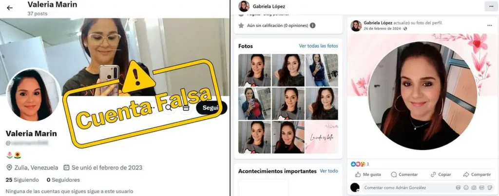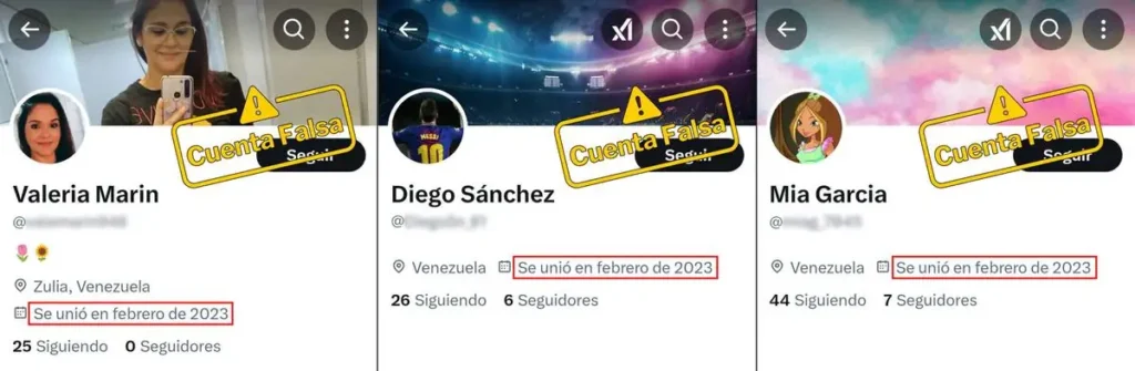 La mayoría de las cuentas identificadas muestran un patrón común: utilizan fotos de perfil genéricas y casi no incluyen información en sus biografías, lo que dificulta verificar si pertenecen a usuarios reales. Al menos una de estas cuentas usa la fotografía de una mujer que aparece en más de cuatro perfiles distintos en varias redes sociales y páginas web, lo que confirma su falsedad. Además, estas cuentas suelen registrar nombres de usuario alfanuméricos o en inglés, sin ninguna relación con el contenido que comparten, reforzando su anonimato.