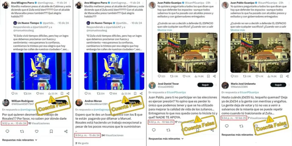 También identificaron respuestas críticas a tuits de Juan Pablo Guanipa, quien ha optado por no apoyar la participación electoral de 2025 impulsada por Rosales, enfocando su actividad política en reclamar la victoria de Edmundo González Urrutia en las elecciones del 28 de julio de 2024.