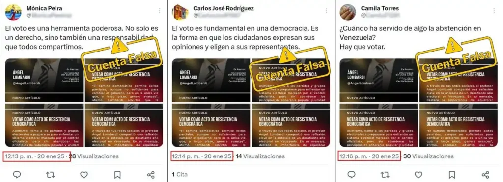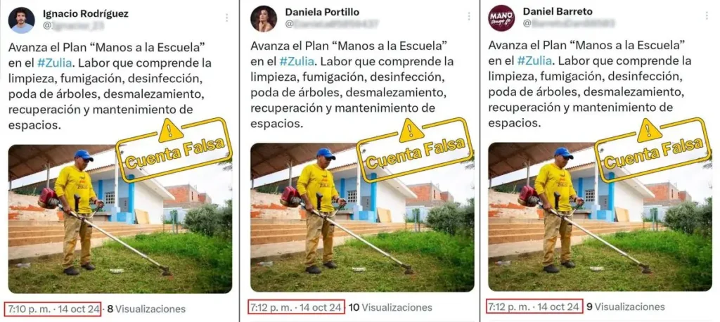 Cuando se trata de cuentas bots, o cuentas automatizadas, es común que compartan secuencias de publicaciones en el mismo orden y con patrones repetitivos. La mayoría de las cuentas analizadas no solo comparten contenido en forma de apoyo a Manuel Rosales, sino que también interactúan con los mismos hashtag, imágenes y videos. Además, replican mensajes idénticos en fechas y horas similares, lo que sugiere un esquema de publicación coordinado o automatizado en X.