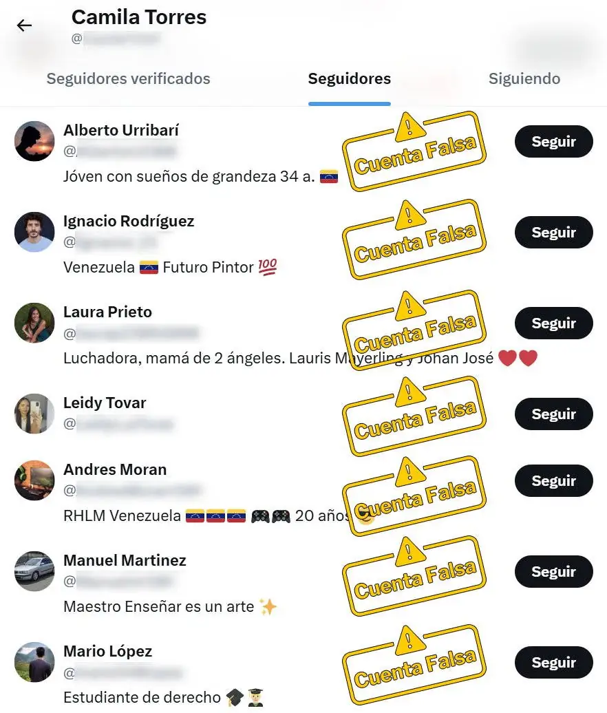 La mayoría de estas cuentas comparten las mismas listas de seguidos y seguidores, lo que confirma que forman parte de una red específica de bots. Por ejemplo, uno de los perfiles identificados sigue a 34 usuarios, de los cuales 19 pertenecen al grupo investigado. A su vez, este perfil cuenta con 20 seguidores, de los cuales 19 también forman parte de esta estructura. Esta estrategia busca simular respaldo y atención por parte de otros perfiles, creando una apariencia artificial de autenticidad.