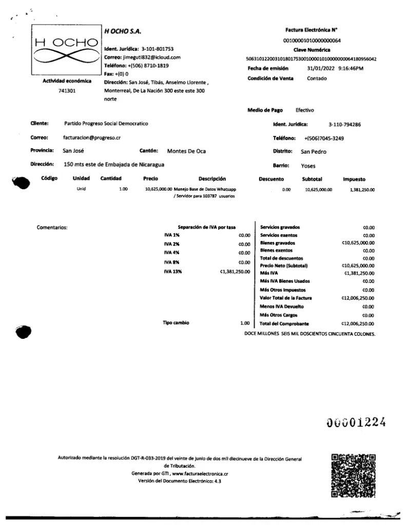 Una segunda factura fue tramitada el 31 de enero del 2022 por un monto de ¢12.006.250 bajo la descripción “Base de Datos WhatsApp Servidor para 103.787 usuarios”. Brunner realizó el pago un día después.