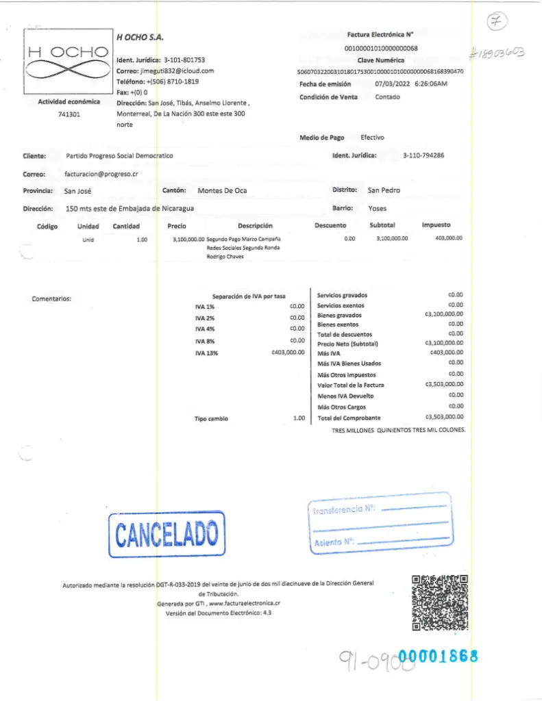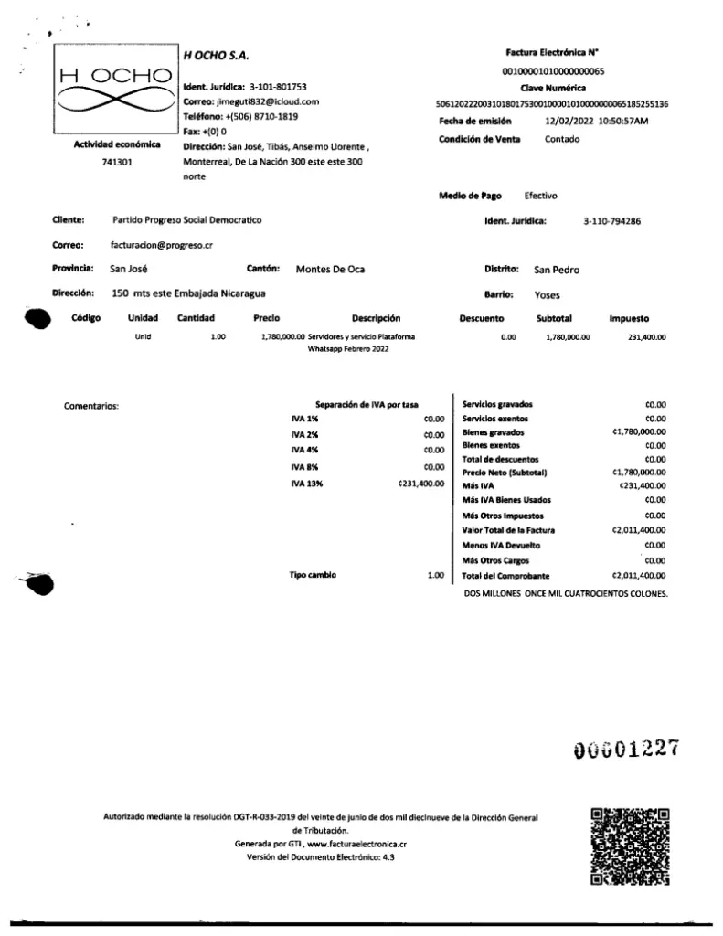 En total, a Cruz se le pagaron cinco facturas, que sumadas alcanzaron los 25 millones de colones, según la declaración de gastos presentadas por el Partido Progreso Social Democrático al Tribunal Supremo de Elecciones (TSE).