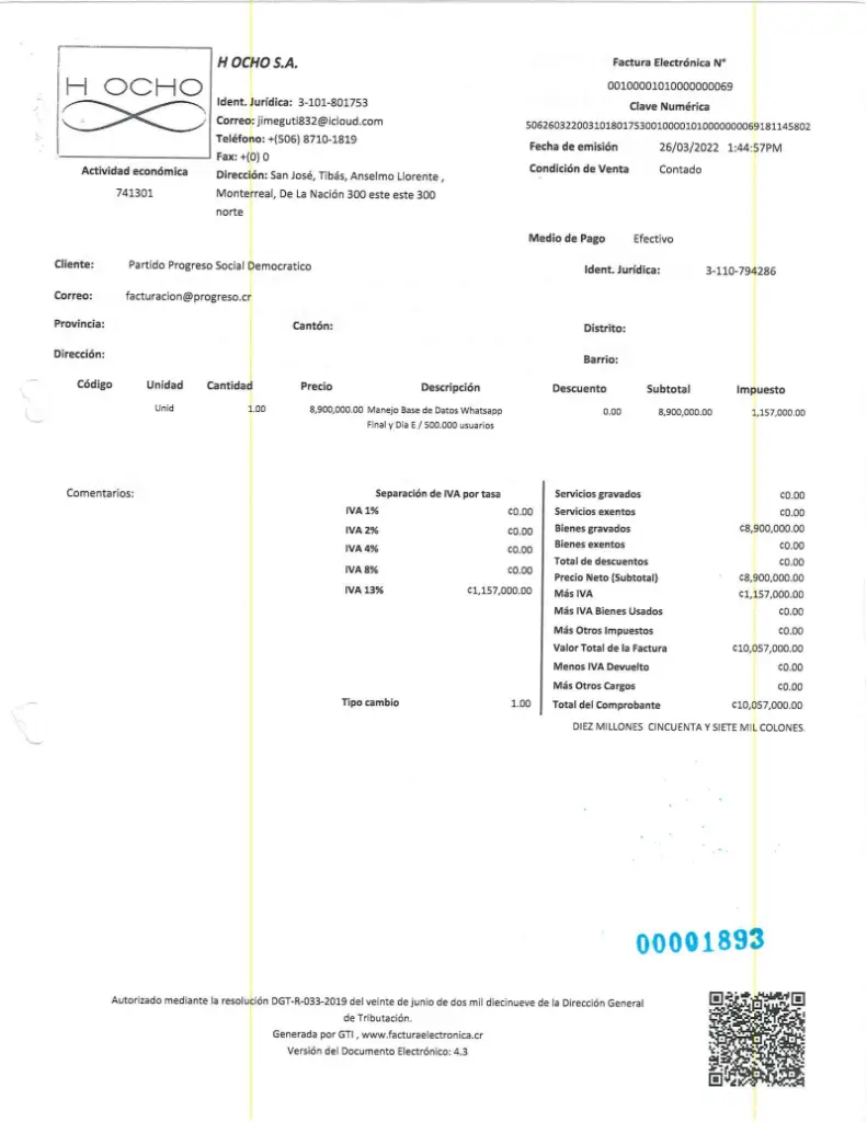 El 26 de marzo del 2022, se hizo un nuevo cobro, esta vez por “Manejo Base de Datos WhatsApp Final y Día E/500.000 usuarios” por un total de ¢10.057.000. Este fue cancelado, el mismo día, por una transferencia del mismo banco realizada a las 3:45 p.m. por Brunner Neibig.