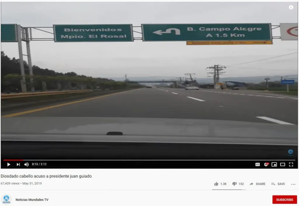 En un video en particular, el narrador, de acento colombiano (al igual que muchos de los otros canales estudiados), se encontraba a bordo de un vehículo, desarrollando contenido noticioso de interés principalmente para venezolanos: un video de título “Diosdado Cabello acusó a Presidente Juan Guaidó”, publicado el 31 de mayo de 2019.