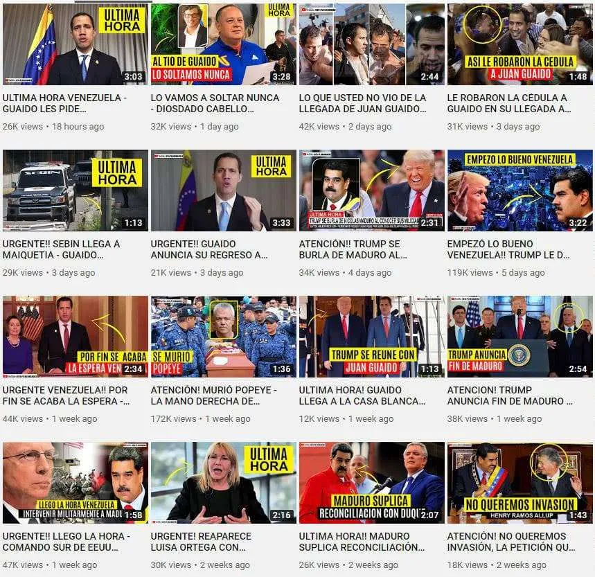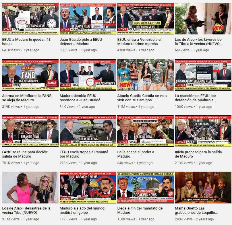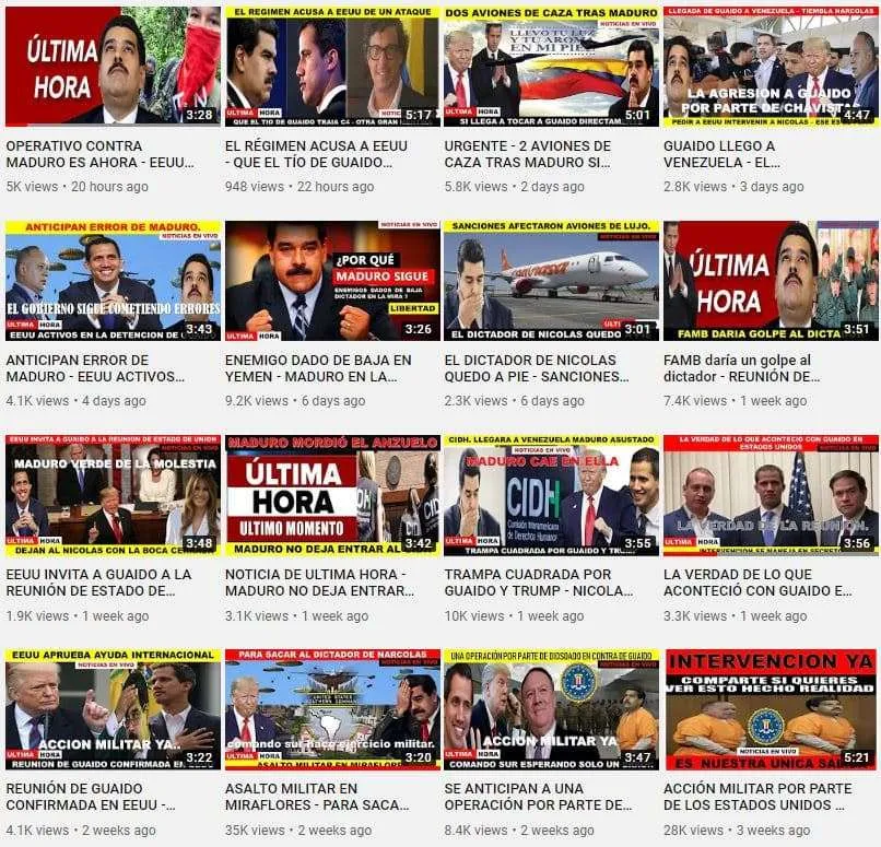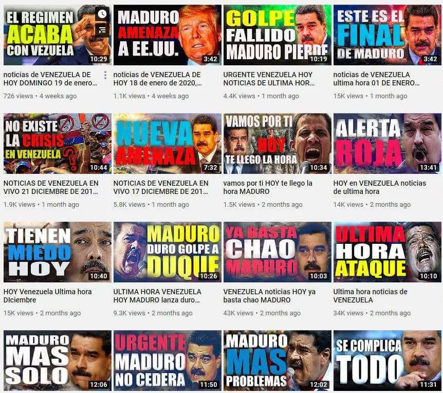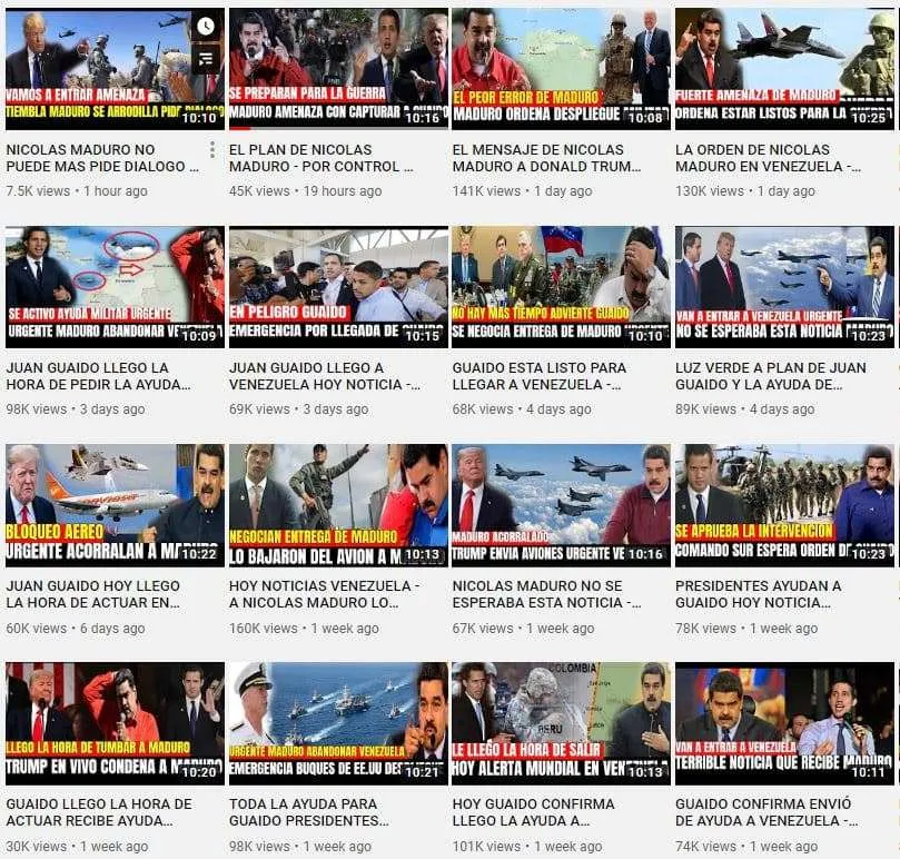 Dos de los canales estudiados ya habían difundido noticias engañosas que llegaron a su momento al Foro Cazadores y fueron desmentidas: “Ventana al Mundo 24 Horas” y “Noticias Mundiales al Día”. En ambos canales se ha publicado gran cantidad de videos con contenido engañoso que hacen hincapié, sin mostrar pruebas, en la existencia de negociaciones entre Rusia y los Estados Unidos para finalizar la dictadura venezolana, en la inminencia de un ataque militar en Venezuela por parte del gobierno de los Estados Unidos o en la necesidad del uso de la fuerza para derrocar a Nicolás Maduro.