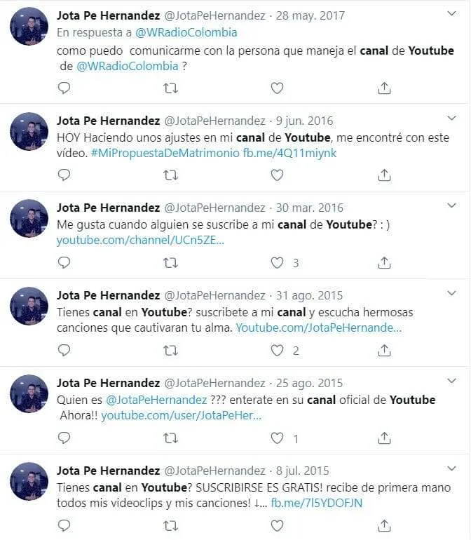 Un caso notorio es el del canal “Jota Pe Hernández”. Su autor inicialmente usaba el canal para subir creaciones musicales. Según aparece en su cuenta de Twitter, Jota Pe solía subir a su canal de YouTube sus propias canciones antes del año 2017, pero desde julio del año 2019, en su canal solamente publica noticias sobre Venezuela y sus canciones, fueron ocultadas (o eliminadas):
