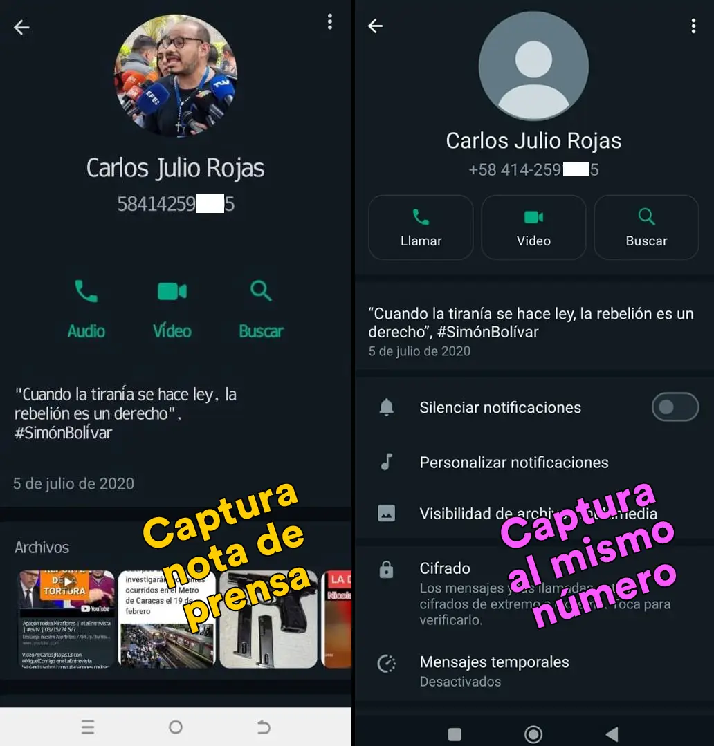 El número de teléfono que aparece en el tope del pantallazo del contacto de WhatsApp asociado con Carlos Julio Rojas presenta una inconsistencia notable: aparece de la siguiente manera: «58414259XXX5», sin el símbolo “+” al inicio. Esta información es inconsistente con la forma en la que WhatsApp formatea visualmente los números de los contactos, separándolos con guiones “-” y espacios, para facilitar su lectura.