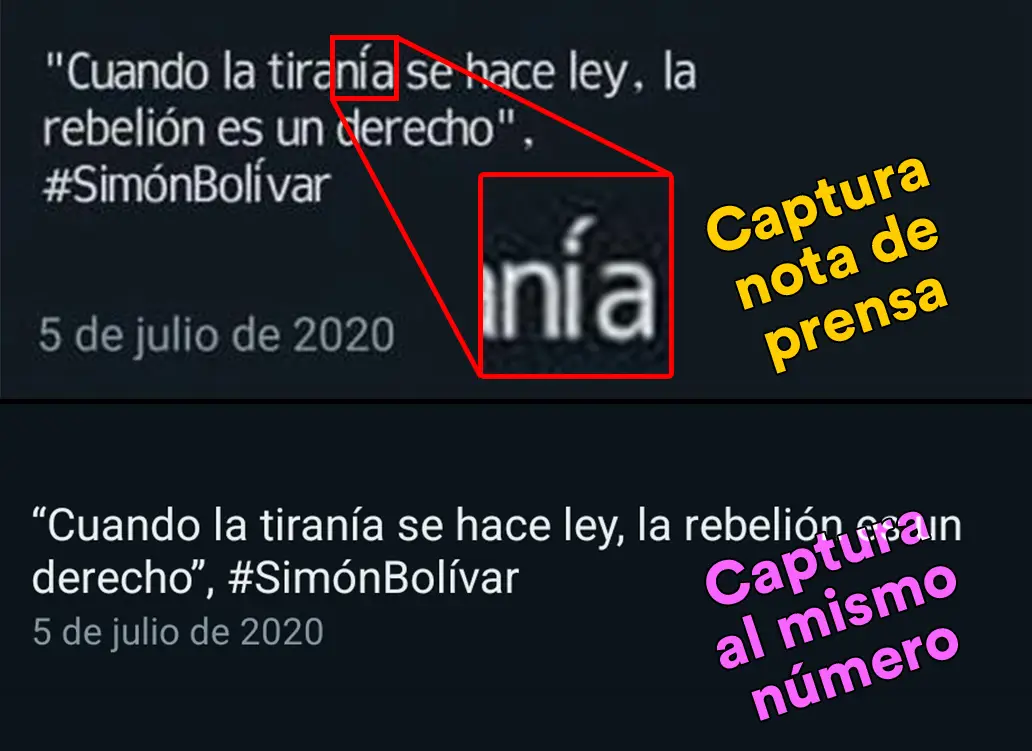 En la captura del perfil de Rojas presentada en la nota de prensa, aparece una cita de Simón Bolívar, dividida en tres líneas: «»Cuando la tiranía se hace ley, la (1° salto de línea) rebelión es un derecho», (2° salto de línea) #SimónBolívar». Incluso considerando el tamaño de la fuente, estos saltos de línea no aparecen en el texto que aún permanece en el perfil de WhatsApp de Rojas y, considerando el espacio disponible a la derecha de la segunda línea, es improbable que el cliente de WhatsApp de Ostos haya cortado y dejado en la tercera línea, solamente, a la etiqueta #SimónBolívar.
