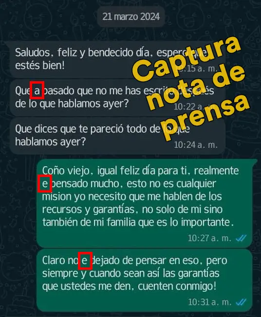 El espaciado entre palabras también arroja más puntos de duda. En todos los pantallazos de la conversación existe un error ortográfico casi imperceptible: la aparente inclusión de espacios dobles luego de que se escribe una coma “,” como signo de puntuación.