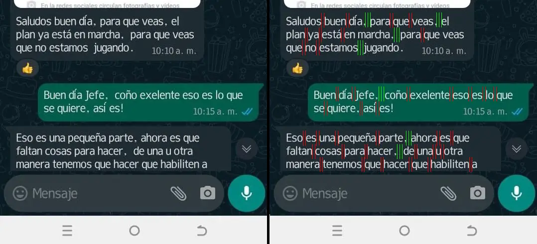Pero esto es muy improbable que ocurra, simultáneamente, en textos escritos por dos usuarios distintos. En los pantallazos distribuidos, tanto las frases supuestamente escritas por Rojas como por Ostos, siempre tienen el mismo doble espacio luego de cada coma: