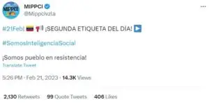 El 21 de febrero, a las 5:26 p.m., el MIPPCI promovió como segunda etiqueta del día #SomosInteligenciaSocial, acompañada del mensaje “¡Somos pueblo en resistencia!”.