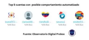 Además, logramos identificar a las 5 de cuentas principales con mayor comportamiento posiblemente automatizado que publicaron mensajes con la etiqueta: