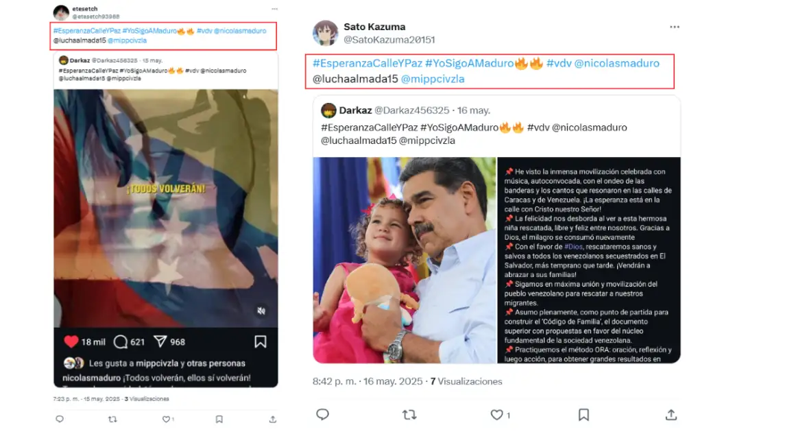 Un ejemplo de estos mensajes reza: #EsperanzaCalleYPaz #YoSigoAMaduro🔥🔥 #vdv @nicolasmaduro @luchaalmada15 @mippcivzla