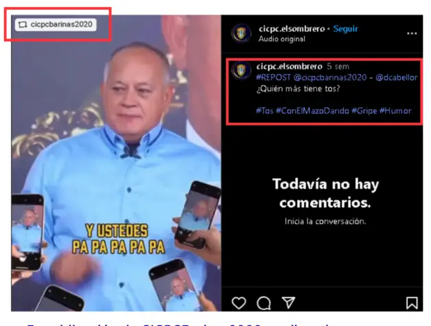 Precisamente la cuenta de Instagram @CicpcBarinas2020 es una de las piezas centrales de este sistema. Esta cuenta funciona como un nodo de distribución: toma contenido del programa de Cabello (@mazo4f) y lo repostea, para que luego otras cuentas regionales y municipales del CICPC lo vuelvan a publicar. Es un sistema jerárquico y automatizado que garantiza que un mismo mensaje se multiplique por todo el país. El resultado: saturación y repetición.