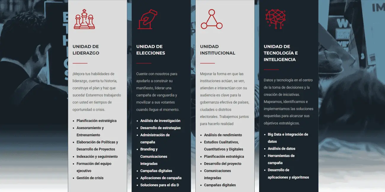 Según la página web de Venqis, la empresa había acumulado “46 campañas políticas y cambios institucionales exitosos en los últimos años”. Hay rastros en línea de que la empresa estuvo involucrada en la consultoría estratégica para varios gobiernos, líderes y partidos políticos en Latinoamérica.