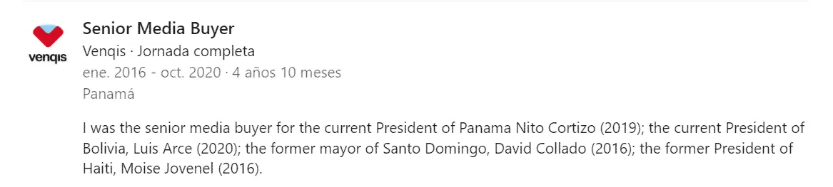 El papel de Venqis, formal o informalmente, en las campañas electorales de varios presidentes latinoamericanos, aparece involuntariamente confirmado en el perfil en Linkedin de uno de sus exempleados, que laboró en la empresa hasta octubre 2020.