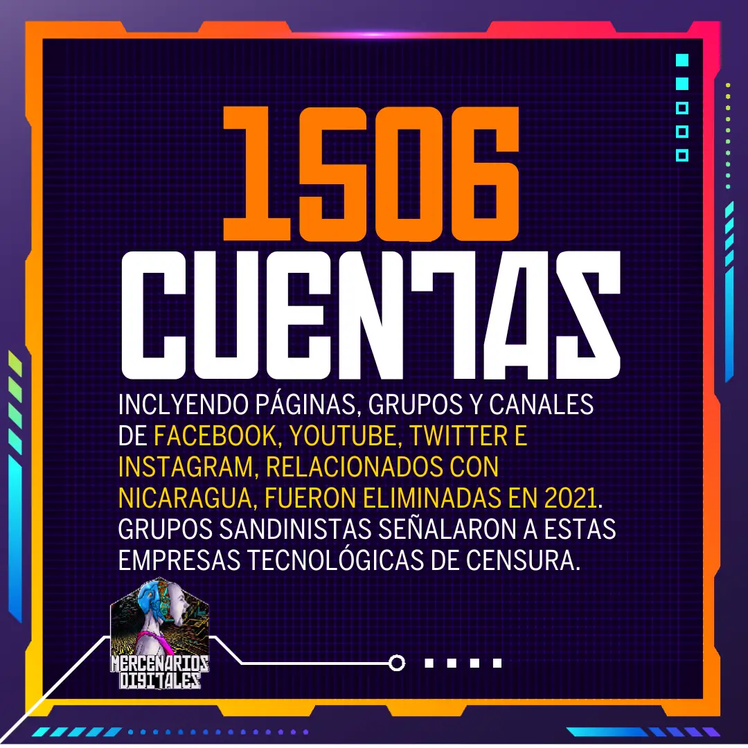 Algunas de las cuentas tenían perfiles que fueron suspendidos en más de una red social. Es el caso de Barricada y Redvolución, que fueron eliminadas de Facebook, Instagram y Twitter, y de la Red de Jóvenes Comunicadores y La MoraLimpia Sandinista, borradas tanto de Facebook como de Instagram.