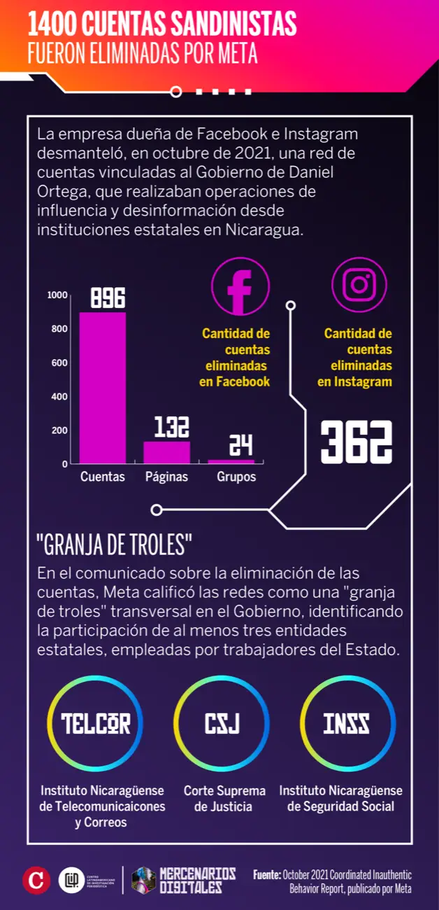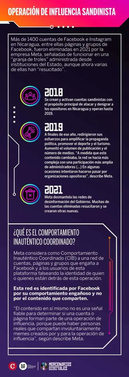 Una compleja red con más de 1.400 páginas, grupos y usuarios, desmantelada por Meta en 2021, operada por personal e instituciones de la dictadura Ortega-Murillo en forma coordinada para falsear opinión, distribuir propaganda y mensajes de odio, resucitó y continúa sus operaciones de influencia