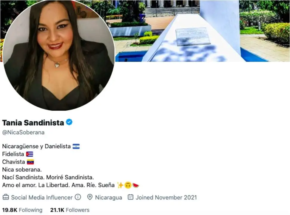 En Twitter, las cuentas más populares que revivieron pertenecen a “influencers sandinistas”. La cuenta @taniasandinista (que ya había sido suspendida temporalmente en noviembre de 2018), por ejemplo, fue suspendida definitivamente en octubre de 2021. Sin embargo, revivió como @nicasoberana en noviembre del mismo año y ya cuenta con más de 23.000 seguidores. Otra de sus cuentas, @TaniSandinista3, también fue suspendida.