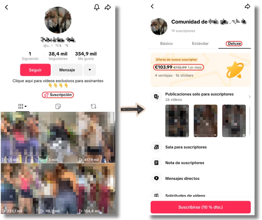 “Clique aquí para vídeos exclusivos”, invita uno de los perfiles de TikTok con casi 40.000 seguidores que recopila y republica vídeos de chicas reales con apariencia de ser menores de edad en su mayoría vestidas con uniforme escolar. Para acceder a este contenido oculto, los usuarios deben pagar una cuota mensual a modo de suscripción. En este caso, pueden escoger entre tres paquetes diferentes (básico, estándar o deluxe) con precios que oscilan entre los 3,49 y los 115,99 euros al mes. TikTok se queda con una parte de estos beneficios (varía según la región y otras características, pero en algunos casos puede ascender hasta el 50%).