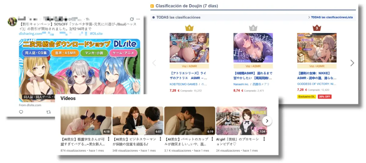 La última cuenta publica contenido generado con inteligencia artificial de mujeres japonesas infantilizadas. Tiene en su biografía un enlace a una cuenta de Twitter (ahora X) con apenas una veintena de seguidores, desde la que redirige a una página web con doujinshi (publicaciones independientes dentro del mundo del manga) eróticos. En su biografía tiene un enlace a un canal de YouTube que describe sus publicaciones como “contenido artístico que persigue la belleza de las mujeres”. Son vídeos generados con inteligencia artificial en los que aparece, por ejemplo, una enfermera besando a un hombre hospitalizado mientras le da de comer. Otro de los enlaces redirige a una página web japonesa con contenido para adultos.