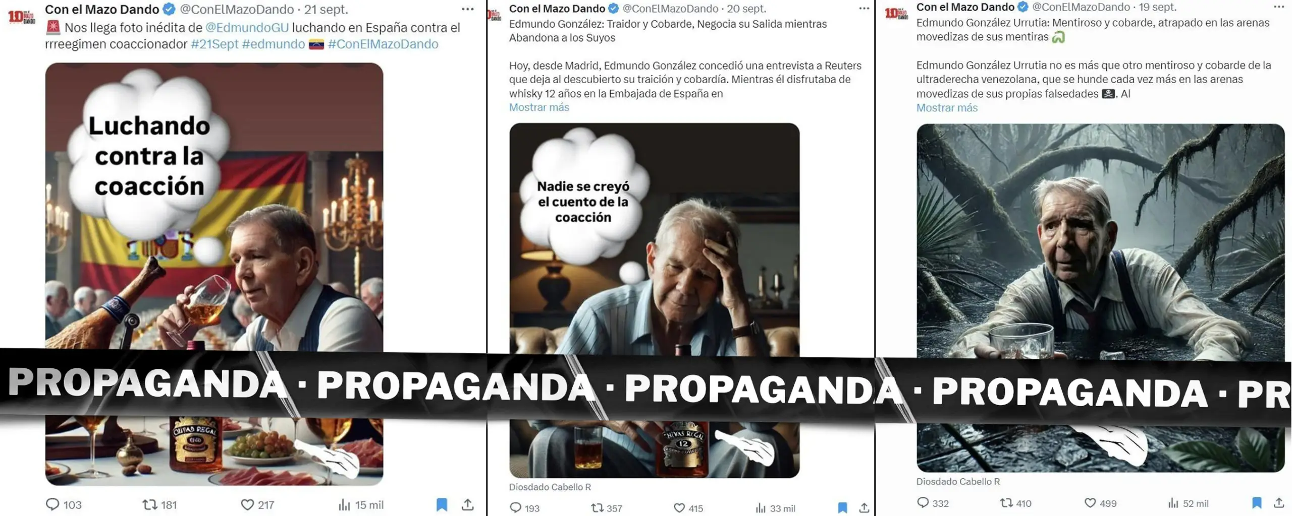 Desde las redes sociales de “Con El Mazo Dando” —programa transmitido por VTV y conducido por el ahora ministro del Interior, Diosdado Cabello — se ha publicado una serie de imágenes creadas con IA, que satirizan y distorsionan el proceso de firma del documento con el que se permitió la salida al exilio de González Urrutia. El uso del lujo, el humor sarcástico y la crítica a su estancia en el extranjero son herramientas que intentan deslegitimar su posición.