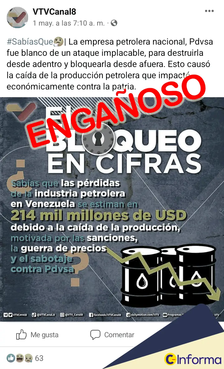 “La empresa nacional Pdvsa fue blanco de un ataque implacable para destruirla desde adentro y bloquearla desde afuera. Esto causó la caída de la producción petrolera que impactó económicamente contra la patria”, se lee en una publicación en el perfil de Facebook de VTV el 1 de mayo de 2023.