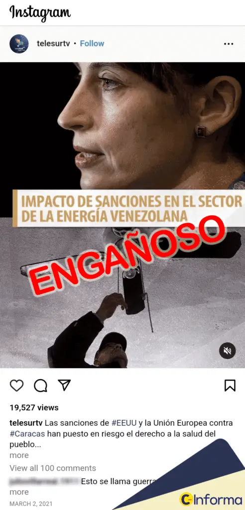 En el caso de Instagram, un video publicado el 2 de marzo de 2021 por Telesur fue el que se hizo más viral, casi 20 mil vistas. La publicación forma parte de una serie sobre declaraciones de Alena Douhan, relatora Especial de Derechos Humanos de la ONU, que visitó Venezuela y emitió un informe que describe cómo las sanciones “han exacerbado una crisis humanitaria enorme contra el pueblo”.