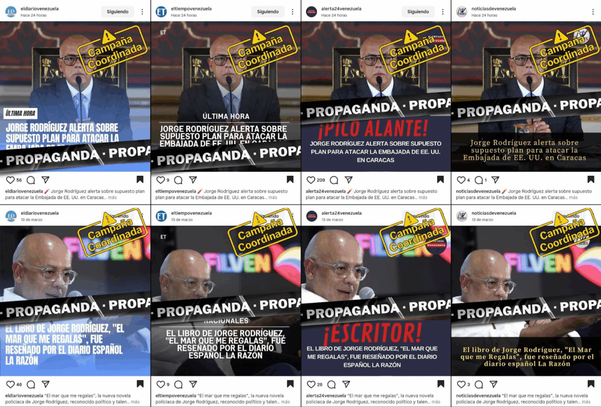 En Instagram, la “denuncia” realizada por el presidente de la Asamblea Nacional, Jorge Rodríguez, se difundió coordinadamente por la red de falsos noticieros identificada por Cazadores de Fake News como “La Fábrica de Desinformación”. Estas mismas cuentas, en el pasado, han difundido propaganda encubierta a favor del mismo Jorge Rodríguez y otros voceros del oficialismo venezolano.