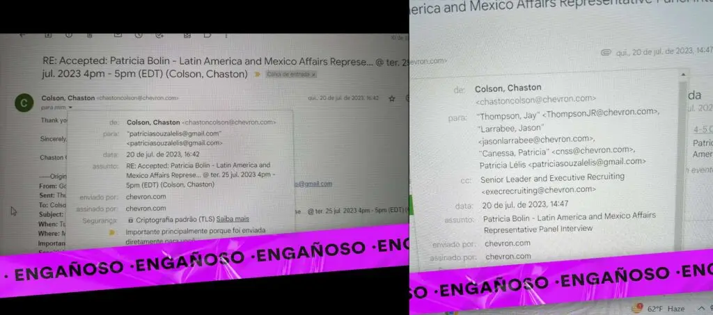 El correo del personal de Chevron a Patrícia Lélis fue enviado poco después, el 20 de julio, y la entrevista fue pautada para el 25 de julio. Por eso es bastante probable que estos correos —que no prueban nada— sean legítimos.