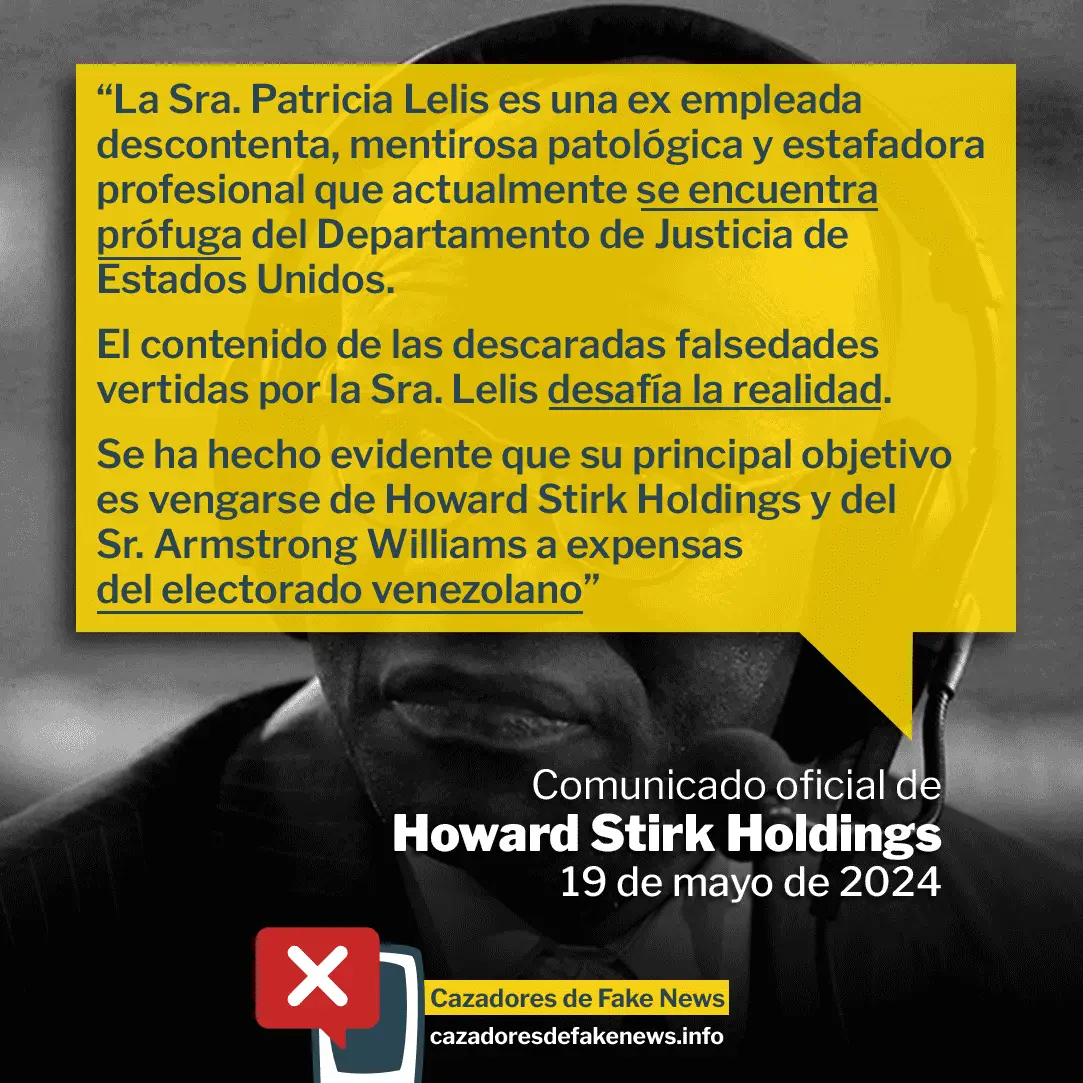 En lo relacionado a Patricia Lélis, Cazadores de Fake News consultó al grupo televisivo Howard Stirk Holdings, que es propiedad y está gestionado por el periodista, empresario y productor de televisión Armstrong Williams. La respuesta oficial señala que Lélis actúa con motivación de venganza y que sus declaraciones distan de realidad.