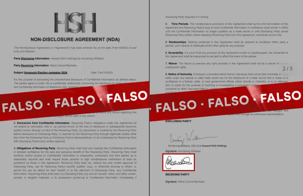 El acuerdo de confidencialidad que lleva las firmas de María Corina Machado y de Armstrong Williams es una FALSIFICACIÓN