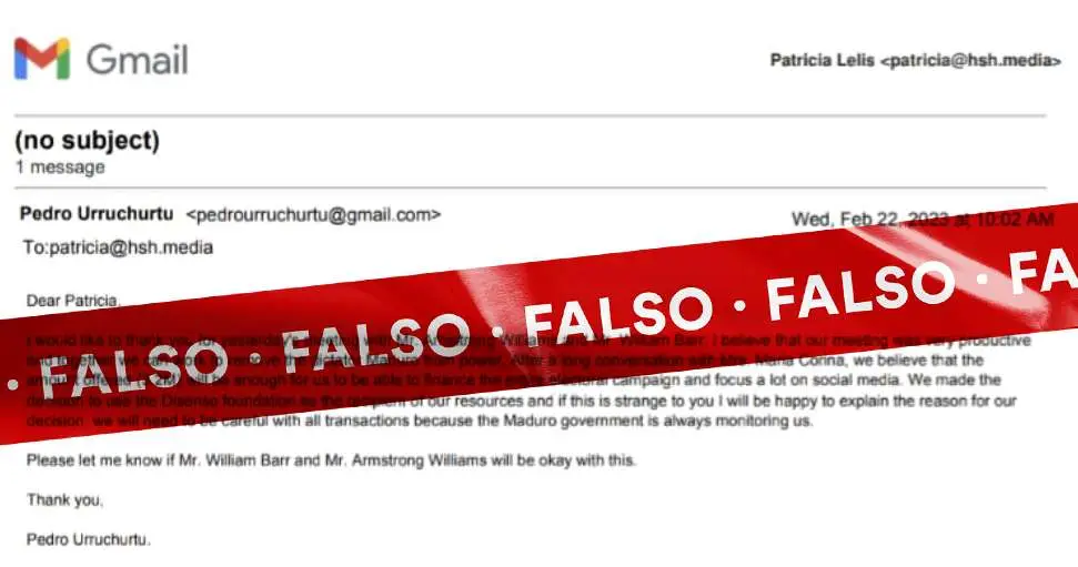 Por lo anterior, y tomando en cuenta el uso recurrente de conversaciones de WhatsApp forjadas —que en el pasado reciente han sido usadas como desinformación en Venezuela y que también han sido presentadas en el pasado por comunicadores del portal Venezuela News (quien dio la exclusiva de Lélis)—, consideramos que la otra captura del chat vía DM de Twitter entre Armstrong Williams y Patricia Lélis, así como el e mail supuestamente enviado por Pedro Urruchurtu –coordinador de asuntos internacionales del partido opositor Vente Venezuela– a Lélis, también son falsificaciones.