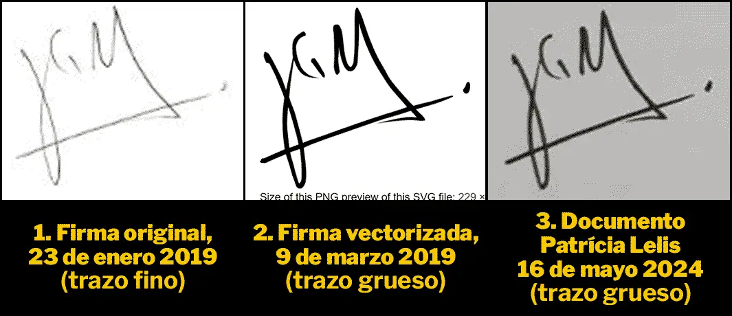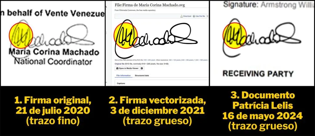 La firma original de trazo fino (1), aparece en este documento del 21 de julio de 2020. Al igual que ocurrió con la página de Wikipedia de Guaidó, el 3 de diciembre de 2021 se creó una versión vectorizada, de trazo grueso (2), que se ve mejor. Esa versión vectorizada, que realmente nunca fue manuscrita por María Corina Machado, fue la que se insertó en el documento presentado el 16/05/24 por Patrícia Lélis (3) y que supuestamente fue firmado el 14 de febrero de 2023, mucho antes de que Machado ganara las primarias.