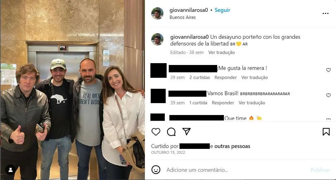 Eduardo Bolsonaro viajó a Argentina acompañado de Giovanni Larosa, el corresponsal en Brasil del portal La Derecha Diario, medio que pertenece a Cerimedo. Este equipo periodístico identificó, en las cuentas rendidas al Tribunal Superior Electoral (TSE), que Larosa recibió dinero de la campaña de 2022 de Eduardo Bolsonaro. Fue posible identificar al menos 3.900 reales (unos 800 dólares) en pagos.
