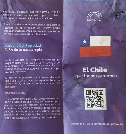 La foto posteada por Grandón en su cuenta de Twitter incluía un subtítulo que contenía una de las afirmaciones que más se repetía en la campaña del terror contra la propuesta constitucional: “El fin de la casa propia”. El texto explicaba que se consagraba el derecho a la vivienda digna “y no el de casa propia. La Convención rechazó todas las indicaciones sobre el acceso a la vivienda propia que se propusieron”. “¿Qué significa esto?”, preguntaba el documento: “la propuesta tiene letra chica, porque bastará con que el Estado te dé una vivienda en arriendo para que se cumpla con ese mandato. Esa casa será del Estado y su asignación dependerá de los políticos de turno”.