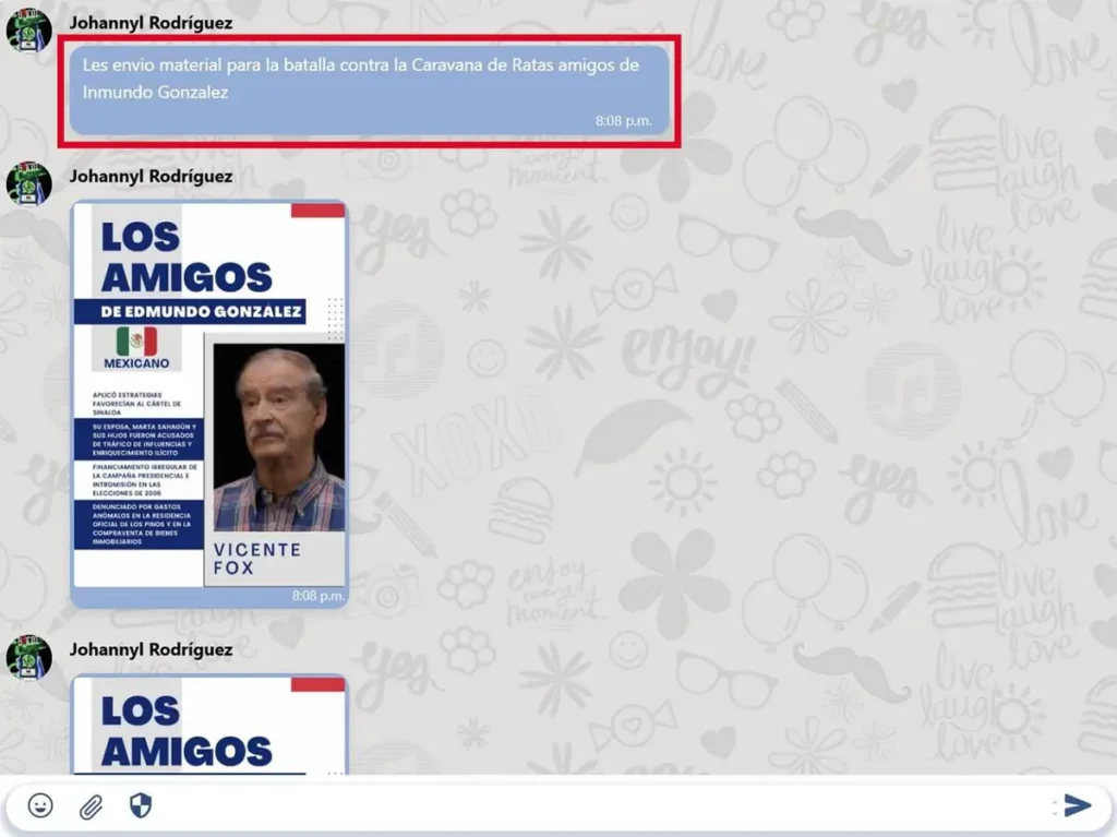 Pero el meme no tuvo el origen viral y espontáneo sugerido por Maduro, sino que formaba parte de una campaña promovida por su propio Ministerio del Poder Popular para la Comunicación e Información (Mippci). Apenas una hora antes de que lo mostrara ante las cámaras —a las 6:51 p. m.— Johannyl Rodríguez, viceministro de Comunicación e Información, lo había enviado a todos los grupos que integran el Siscom: el sistema de mensajería estatal a través del cual se coordinan y ejecutan campañas de propaganda y desinformación gubernamental.