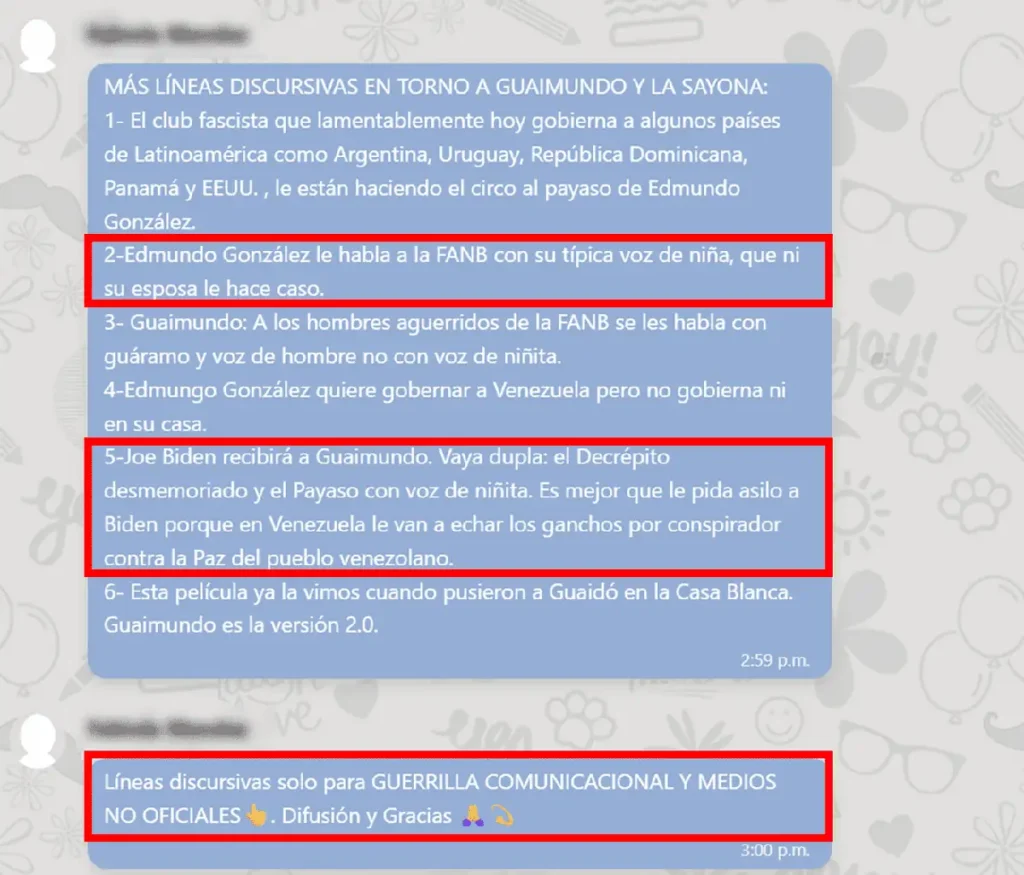 Entre el contenido enviado por el sistema, figuran líneas discursivas que debían ser diseminadas por cuentas de la “Guerrilla Comunicacional y medios no oficiales”, con frases como: “Edmundo González le habla a la FANB con su típica voz de niña, que ni su esposa le hace caso”.Con otro de los mensajes se atacaba a la “dupla” conformada por el ex candidato y el entonces presidente saliente de Estados Unidos. “Joe Biden recibirá a Guaimundo. Vaya dupla: el decrépito desmemoriado y el payaso con voz de niñita”, en alusión a Biden y al propio González Urrutia.