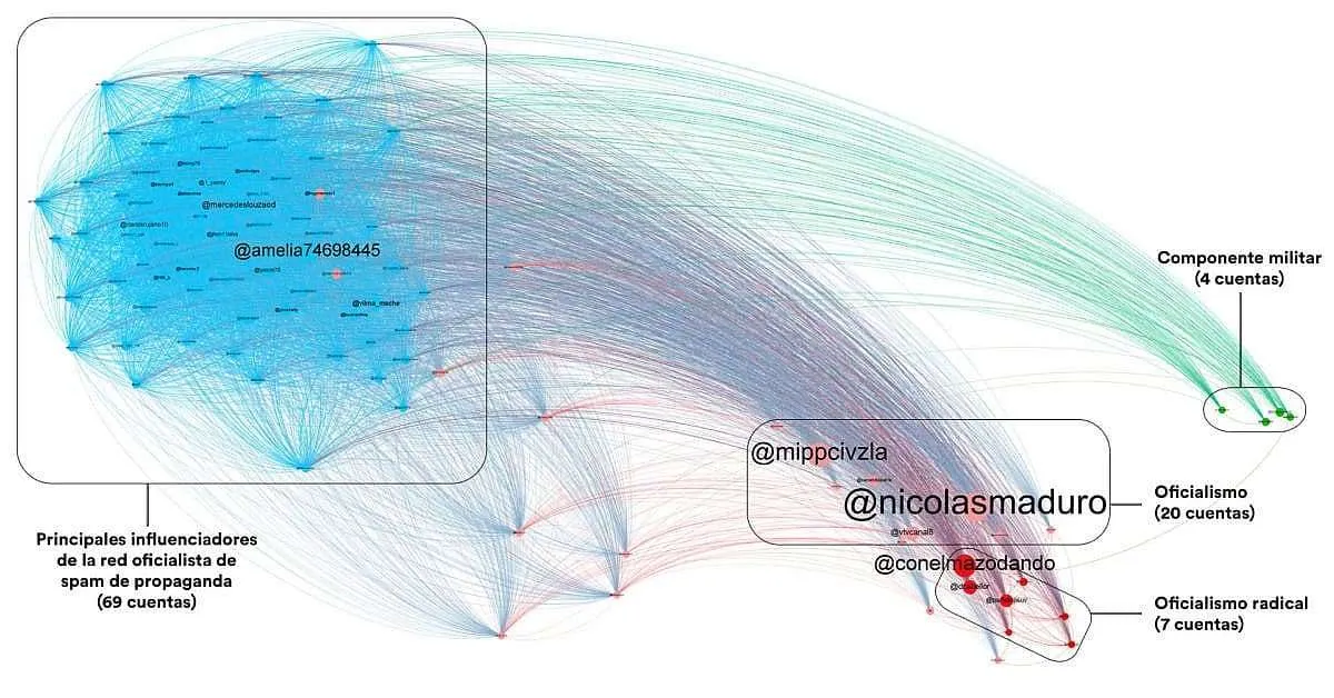 Esta comunidad está compuesta por cientos de cuentas bot (automatizadas) o cyborg (no automatizadas, pero con comportamiento similar a bot), que amplifican las tendencias de propaganda del oficialismo.