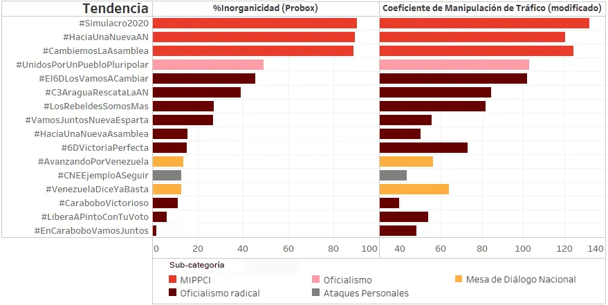 En este enlace puede revisarse la lista de tendencias consideradas por ProBox para este análisis (tendencias del 01 al 15 de noviembre), con sus correspondientes valores de inorganicidad: Las tendencias generadas desde el MIPPCI son altamente inorgánicas, sólo 14% de su contenido está realizado por posibles usuarios reales y aproximadamente el 86% de sus tweets provienen de cuentas falsas o bot. Mientras que por otro lado, las etiquetas provenientes de la Oposición Unitaria presentan un reducido porcentaje (7%) de su contenido como inorgánico o falso.