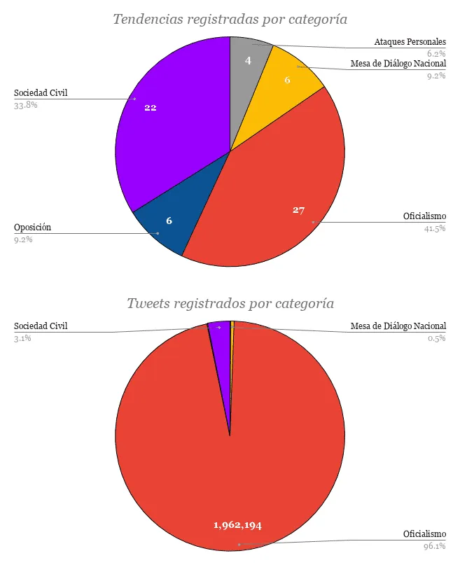 De acuerdo al número de tweets generados, el MIPPCI, quien dicta la política comunicacional oficialista, ha dominado las tendencias electorales. Tres tendencias impulsadas desde el MIPPCI durante la primera quincena del mes de noviembre de 2020, generaron alrededor de 1.748.000 mensajes.