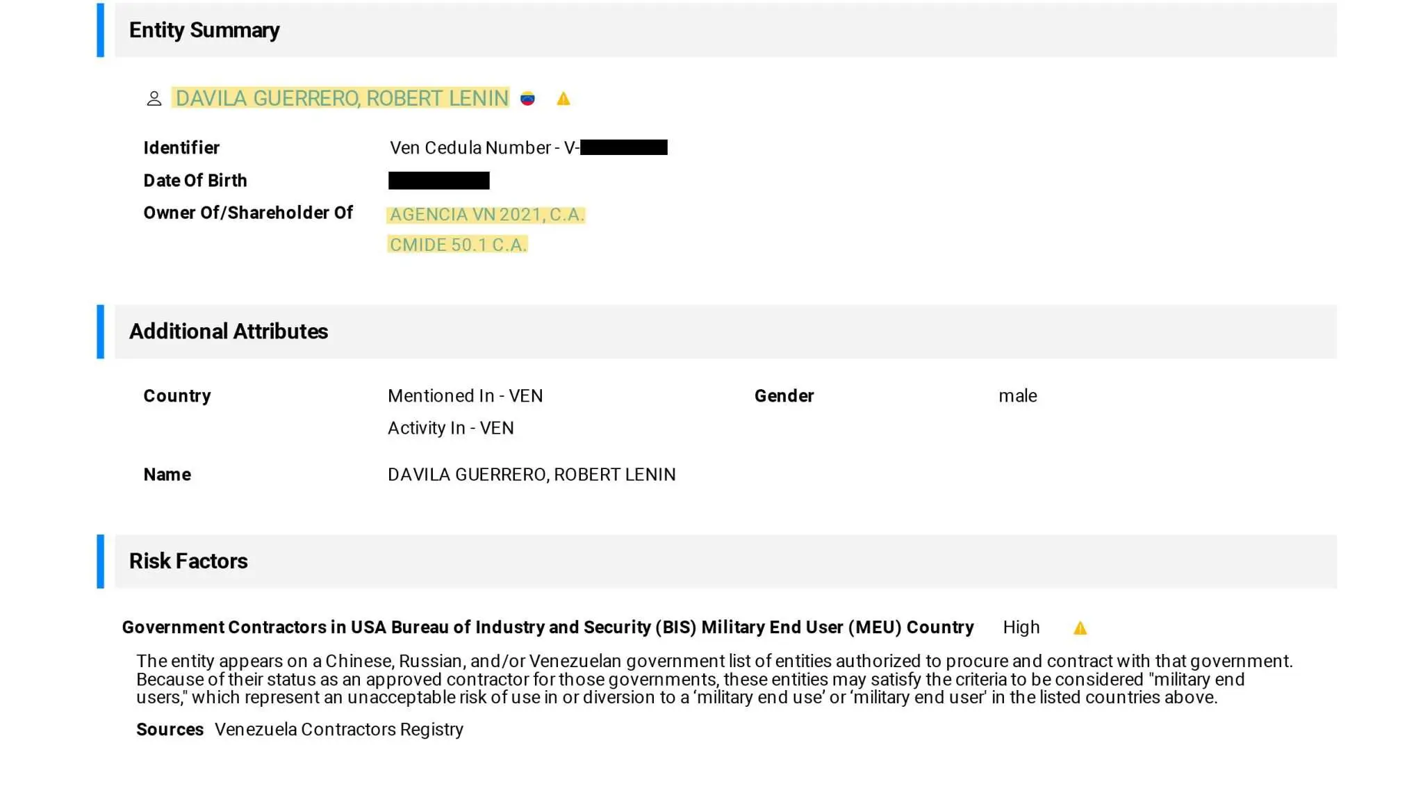 De acuerdo a la información del Registro Nacional de Contratistas (RNC) para la empresa CMIDE 50.1 que está disponible en la plataforma Sayari, un portal de inteligencia de negocios y riesgos de la cadena de suministro entre empresas, se evidencia que Robert Lenin Davila Guerrero, accionista del portal Venezuela News, está asociado con la encuestadora. Aparece como uno de los socios de la empresa de acuerdo al registro disponible en Sayari, con fecha 7 de septiembre de 2019.