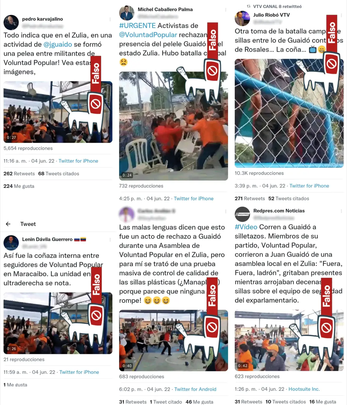 - laiguana.tv: ““Están pintaos”: Nuevo video de evento de Guaidó que terminó con policías viendo sillas volar”, publicado el 4 de junio de 2022. Cita: «Concretamente se logró observar a personas que portaban franelas alusivas al partido radical Voluntad Popular (VP) mientras se arrojaban sillas entre ellos«