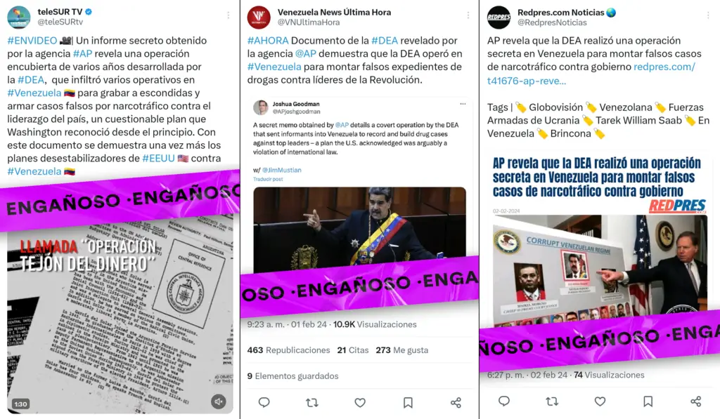 Desde el 1 de febrero, circuló en redes sociales y páginas web la narrativa desinformante de que AP indicaba en su artículo que con la Operación Money Badger la DEA buscaba, de forma encubierta, fabricar falsos expedientes de drogas contra dirigentes del gobierno venezolano.