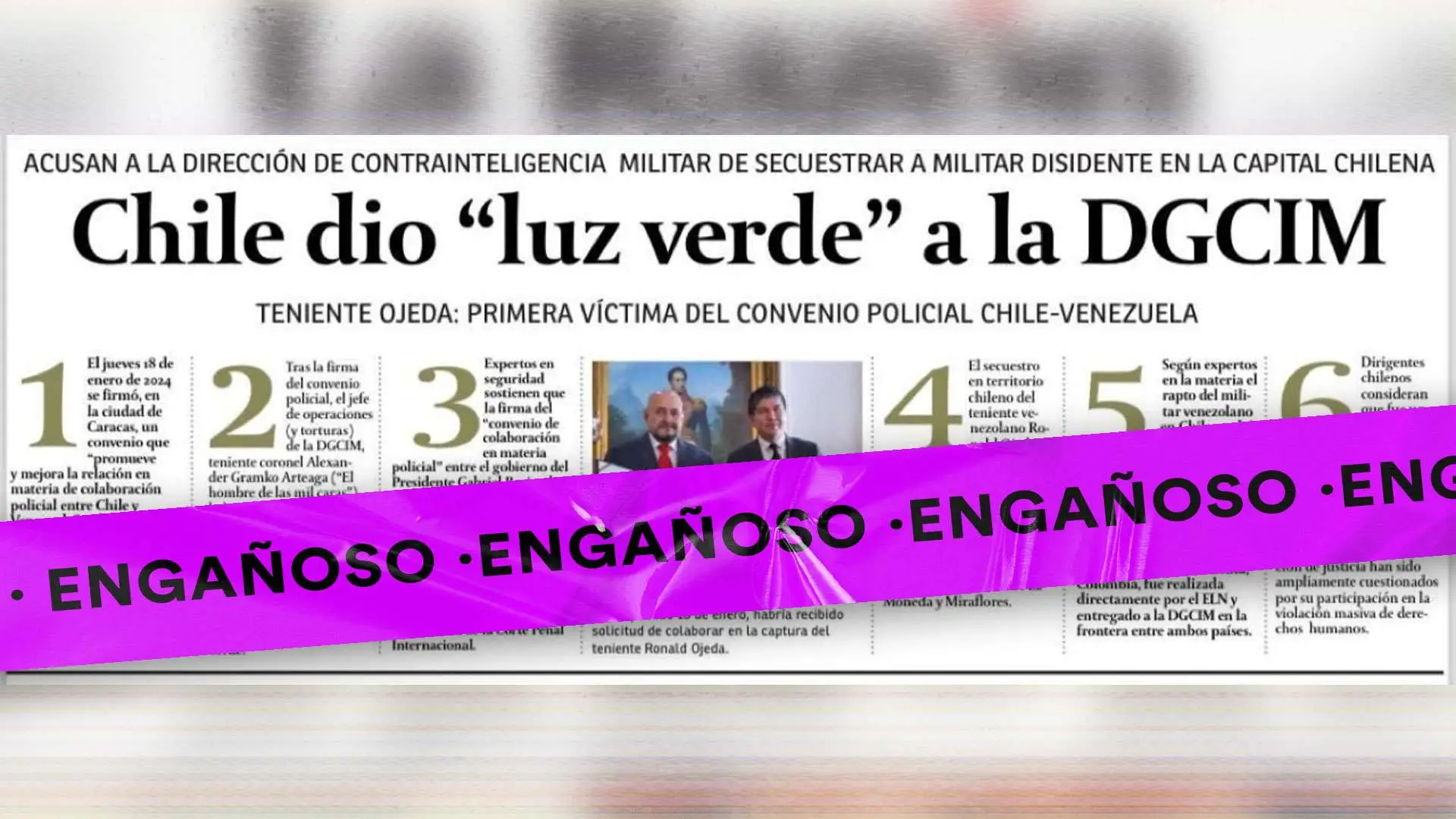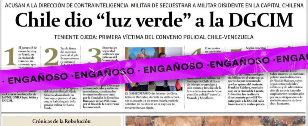 Desde el pasado 25 de febrero circula el rumor de que el convenio policial firmado por los gobiernos de Chile y Venezuela en enero facilitó el secuestro del exmilitar Ronald Ojeda Moreno al permitir la entrada a Chile de la Dirección de Inteligencia Contrainteligencia Militar (DGCIM). El origen del rumor es una publicación de un diario nacional venezolano, en la que titula: “Chile dio ‘luz verde’ a la DGCIM. Teniente Ojeda: Primera víctima del convenio policial Chile – Venezuela”.